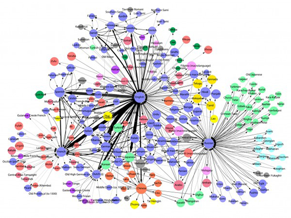 English was the largest hub for information to be translated from one language into another in all three data sets. Russian, German, and Spanish also serve as hubs to other languages, but to a lesser extent compared to English.