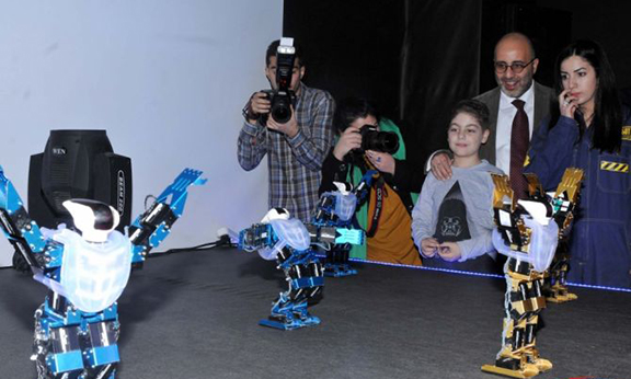 The exhibition that opened in Yerevan on December 8 features over 20 interactive robots from various countries and the best of Armenian robotics. Other entertainments include the dancing robot show, quadcopter zone, robolab, Lego brainstorming/robot building sessions, robot programming and robomarket. Some of these robots include the famous English robot humanoid actor Tespian, the Japanese robot Paro that performs zootherapy, Ukrainian robot waiter Yosha, Robofootball from South Korea, Robot ping pong, the American robot “Baxter” that performs industrial tasks, and other interesting robots with different functionalities as well as the best examples of the Armenian robotics.