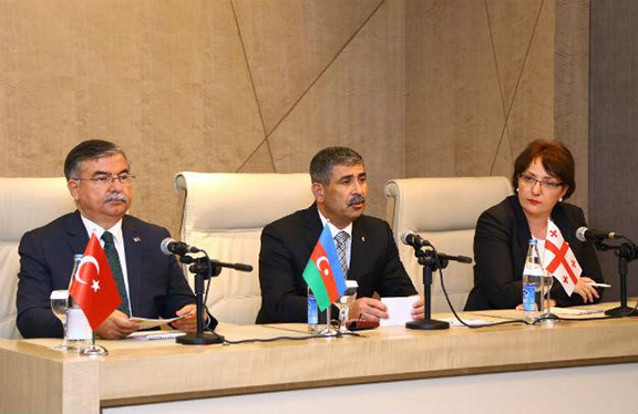 Turkish Defense Minister İsmet Yılmaz, Azerbaijani Defense Minister Zakir Hasanov, and Georgian Defense Minister Tinatin Khidasheli meeting about the three countries’ trilateral military cooperation agreement. (Source: Hurriyet Daily News)
