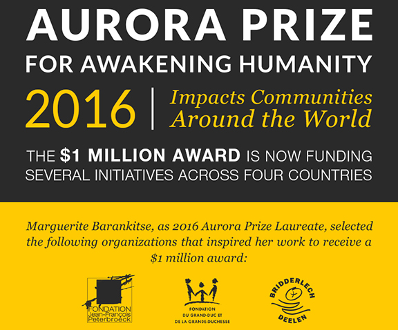 “The beauty of the Aurora Prize is the unique ability to share this wonderful gift with causes so close to my heart,” Aurora Prize Laureate Marguerite Barankitse is quoted in the press release. “Through the Aurora Prize we can show children around the world the power of love and kindness over hate and violence.”