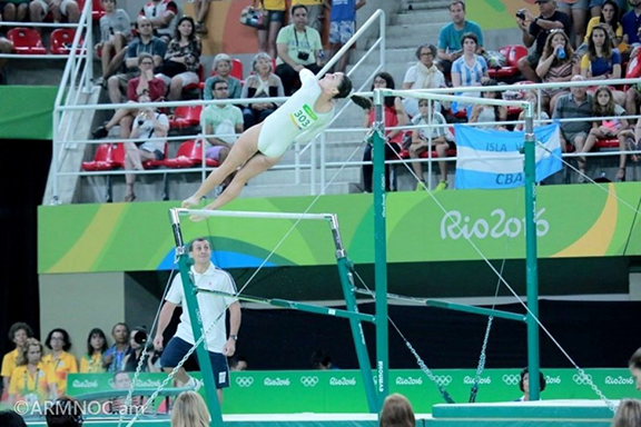 Houry Gebeshian performing the gymnastics element named after her, “The Gebeshian,” at the 2016 Rio Olympics (Photo: Armenian NOC)