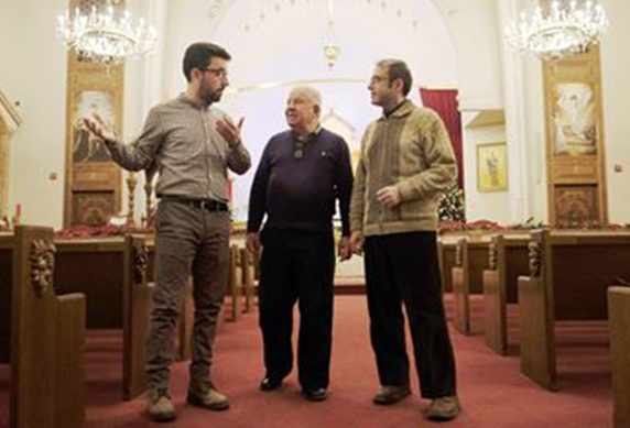 Syrian Armenian Newcomers, Ohannes Tchamichian (left) and Vanig Garabedian (right) talk about successes and challenges of the last year with Apkar Mirakian, who is in charge of the Armenian Community Centre’s Syrian refugee resettlement program in the Armenian Church on Wednesday, Dec. 28. (Photo: Justin Greaves/Metroland)