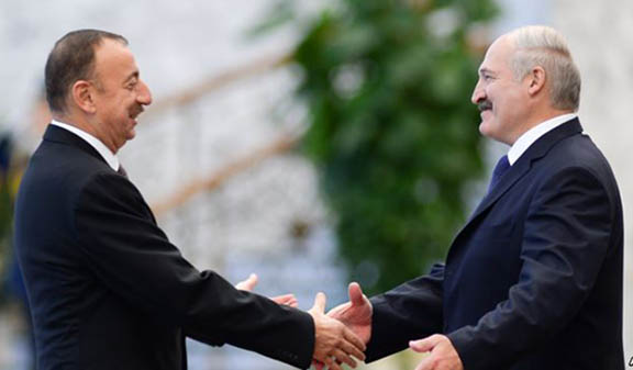 Azeri President Ilham Aliyev greets Belarus President Alexander Lukashenko in 2014