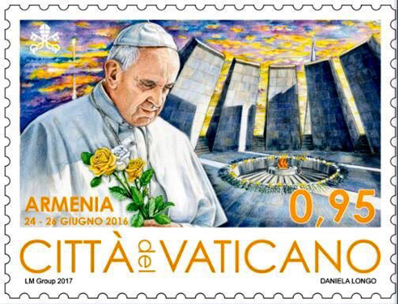 The stamp marking his visit to Armenia is designed by Daniela Longo and depicts the pope in front of the Dzidzernagapert Memorial Monument where he visited on June 25 of that year, accompanied by President Serzh Sarkisian and His Holiness Karekin II, Catholicos of All Armenians.