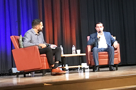 Town Hall moderator Gev Iskajyan (left) with Diaspora Minister Mkhitar Hayrapetyan