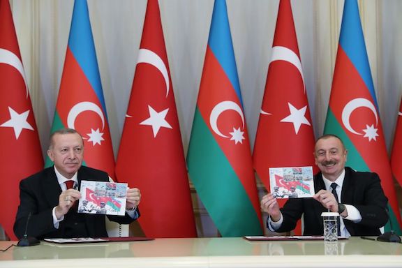 Azerbaijani President Ilham Aliyev (right) with his Turkish counterpart Recep Tayyip Erdogan in Baku on Dec. 10
