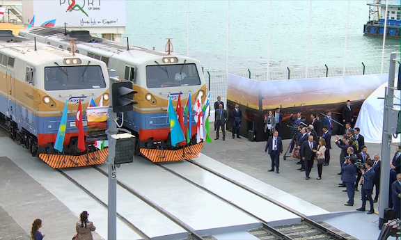 Trains adorned by the Turkish and Azerbaijani flags are docked at the port of Baku