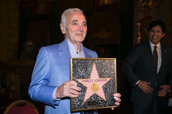 ԼՈՍ ԱՆՃԵԼԸՍ, <<Ա.Էֆ.Փէ.>>.- Հինգշաբթի, Հոկտեմբեր 27ին, Հոլիվուտի <<Փենթէյճըս>> թատերասրահին մէջ տեղի ունեցած արարողութեան մը ընթացքին, Քալիֆորնիոյ նահանգային Ծերակոյտի անդամ Քեւըն տէ Լէոն Հոլիվուտի պատուոյ աստղ մը յանձնեց աշխարհահռչակ ֆրանսահայ երգիչ Շարլ Ազնաւուրին՝ ընդառաջելով հայ համայնքի դիմումին։