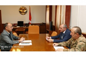 ՍՏԵՓԱՆԱԿԵՐՏ, «Արմէնփրէս».– Արցախի Հանրապետութեան նախագահ Բակօ Սահակեան 6 Օգոստոսին ընդունած է Հայաստանի Հանրապետութեան պաշտպանութեան նախարար Սէյրան Օհանեանը։ Հանդիպման ընթացքին, որուն մասնակցած են Լեռնային Ղարաբաղի պաշտպանութեան նախարար Մովսէս Յակոբեանը, քննարկուած են բանակաշինութեան եւ այդ ոլորտին մէջ երկու հայկական պետութիւններու համագործակցութեան վերաբերող շարք մը հարցեր։