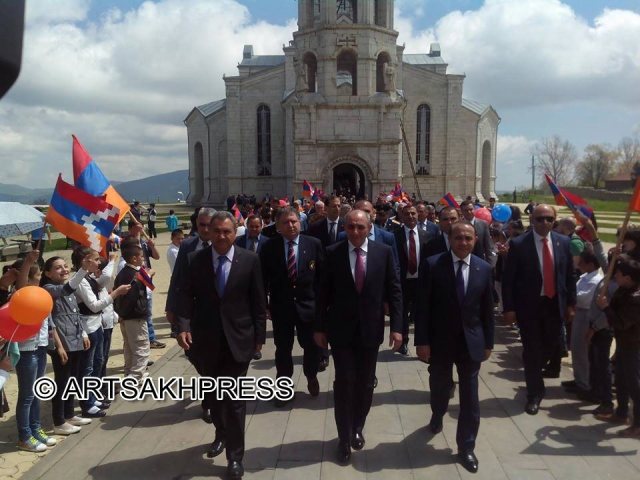 ՍՏԵՓԱՆԱԿԵՐՏ, <<Արցախփրէս>>.– 8 Մայիսին՝ Յաղթանակի 70ամեակին, Լեռնային Ղարաբաղի պաշտպանութեան բանակի եւ Շուշիի ազատագրման օրուան նուիրուած տօնական նախաձեռնութիւններու ծիրին մէջ Արցախի Հանրապետութեան նախագահ Բակօ Սահակեանի գլխաւորութեամբ հայկական երկու հանրապետութիւններու բարձրաստիճան պաշտօնեաներ այցելած եւ ծաղկեպսակ ու ծաղիկներ զետեղած են Շուշի քաղաքի հրետանի-յուշարձանի պատուանդանին, սպարապետ Վազգէն Սարգսեանի եւ Խորհրդային հերոս Նելսոն Ստեփանեանի յուշարձաններուն: