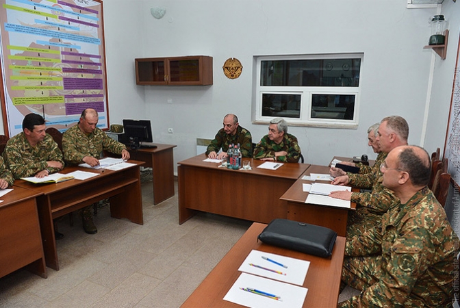 ԵՐԵՒԱՆ, <<Արցախփրէս>> - Արցախի Հանրապետութեան նախագահ Բակօ Սահակեան եւ Հայաստանի նախագահ Սերժ Սարգսեան 19 եւ 20 Ապրիլին այցելած են Լեռնային Ղարաբաղի Հանրապետութեան հիւսիսարեւելեան եւ հարաւային հատուածներուն մէջ տեղակայուած շարք մը զօրամասեր եւ խորհրդակցած հրամանատարական կազմին հետ։ Այս մասին կը տեղեկացնէ Լեռնային Ղարաբաղի Հանրապետութեան նախագահի պաշտօնական կայքը: