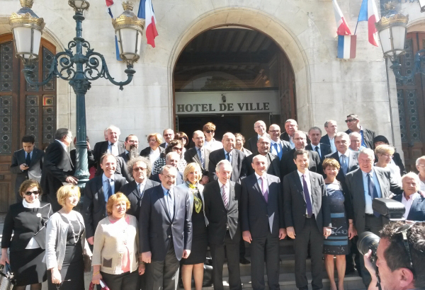 A delegation of high level officials from Artsakh, led by President Bako Sahakian, pose for a photo with regional officials of Drôme at the city hall of the department’s capital Valence. May 18, 2015. (Photo: official publication)
