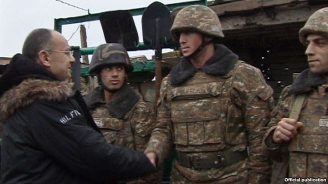 Armenian Defense Minister Seyran Ohanian meets soldiers on front-line duty on December 16, 2014 (Source: RFE/RL)