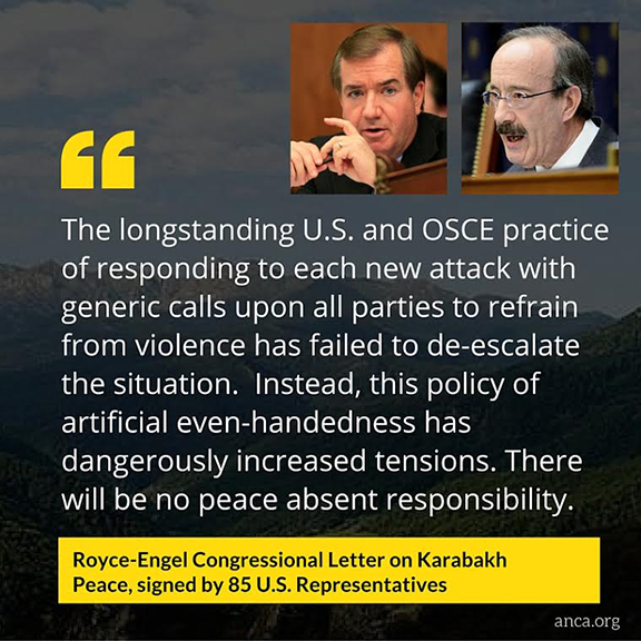 “We commend Chairman Royce, Ranking Member Engel and more than 80 of their House colleagues for proposing common-sense steps to stop the killings, and, more broadly, for promoting an accountability-based approach to peace,” said ANCA Chairman Ken Hachikian. “This bipartisan letter powerfully underscores that America’s leaders – in both Congress and the White House – stand, along with Armenia and Artsakh, on the side of peace. Azerbaijan, in rejecting these peace-keeping measures, persisting in its cross-border attacks, and blocking investigative mechanisms to determine responsibility for acts of violence, is only further confirming its role as the aggressive party and deepening its international isolation.”