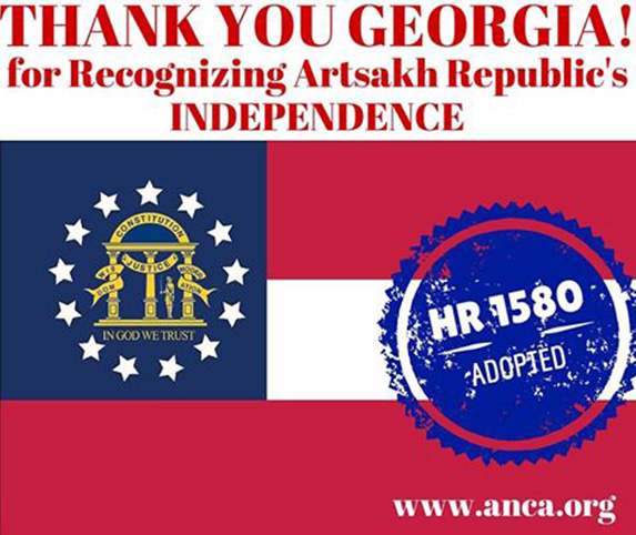 The measure, H.R. 1580, which was brought to the floor for a vote on March 2nd and overwhelmingly adopted on a bipartisan basis, makes Georgia the sixth U.S. state to pass legislation recognizing the Nagorno Karabakh Republic, including California, Louisiana, Maine, Massachusetts, and Rhode Island.